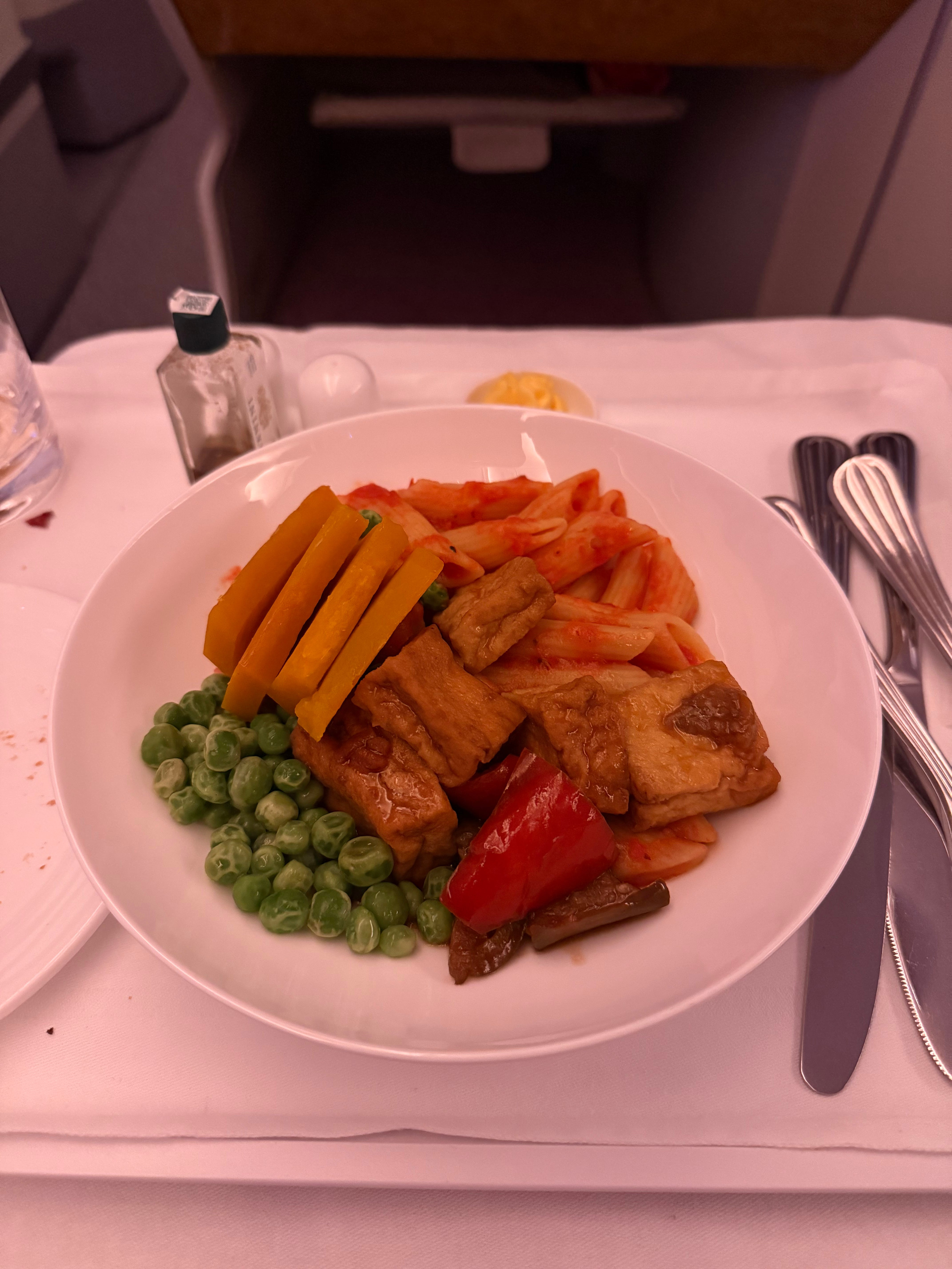 I flew back from Bali this week and spotted a sneaky little discount on upgrades, so I skipped my way into Emirates business class! I had 2 flights, totalling 20 hours of travel, so I wrote this expense off as an investment in not ruining my lower back again. As an added little bonus, the vegan food was actually decent. This meal in particular was a mismatch that just worked. Some sort of tomato pasta, peas, marinated tofu, pumpkin and roasted peppers. I ate every last bit.