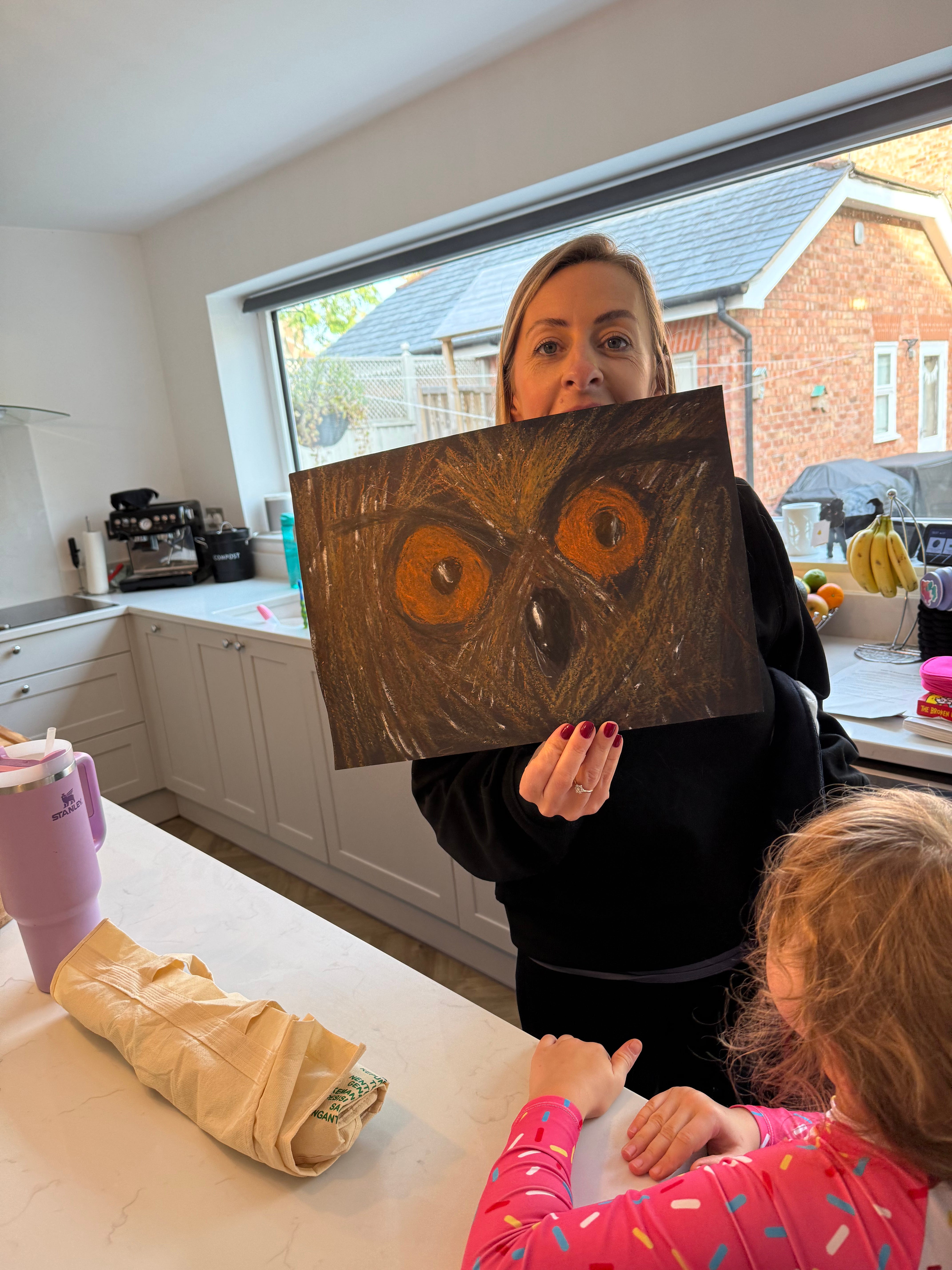 OK, proud uncle alert. LOOK at this picture. My niece Audrina, who is SEVEN, drew it at art club after school. I genuinely gasped when my sister (pictured) pulled it out. The composition, the colour choice, the emotion, it’s spectacular! Look at the three dimensionality of that beak! I’m absolutely obsessed and want it framed immediately.